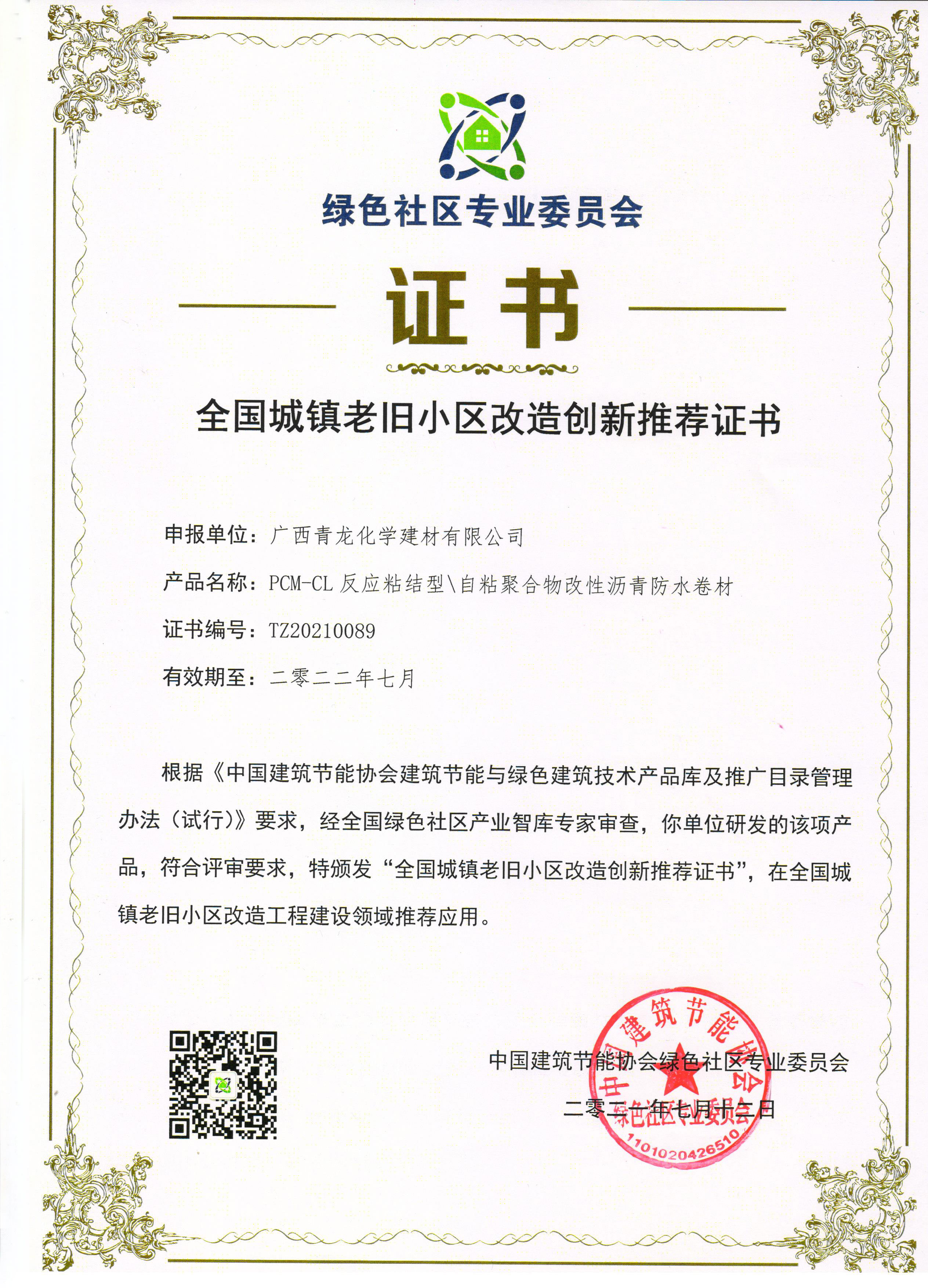 全國城鎮(zhèn)老舊小區(qū)改造創(chuàng)新推薦證書