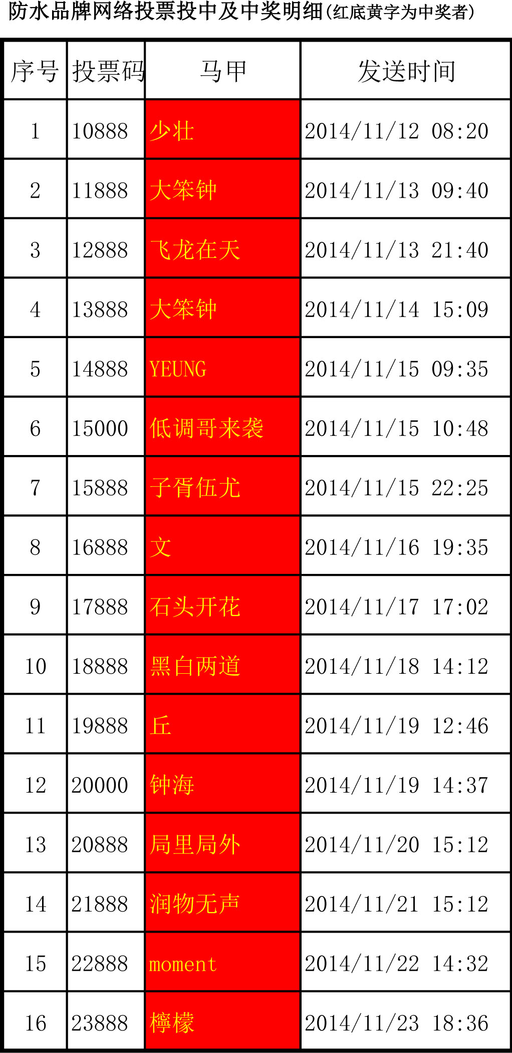 前16項投中及中獎名單公布如下:少壯、大笨鐘、飛龍在天、大笨鐘、YEUNG、低調(diào)哥來襲、子胥伍尤、文、石頭開花、黑白兩道、丘、鐘海、局里局外、潤物無聲、moment、檸檬。恭喜他們,也請大家繼續(xù)支持青龍,只為青龍投票!