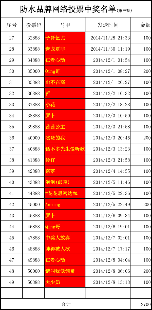 第三批中獎名單公布如下:子胥伍尤、青龍覃非、仁者心動、Qing哥、山不在高、哲、小花、羅卜、茜茜公主、吃貨的我、話不多先生愛聽歌、伶仃、奈落、泡泡(郵箱)、#花花思密達(dá)#&、Anning、羅卜、Qing哥、帥得被人砍、仁者心動、請叫我低調(diào)哥、大少奶。恭喜他們,也請大家繼續(xù)支持青龍,為青龍投票!