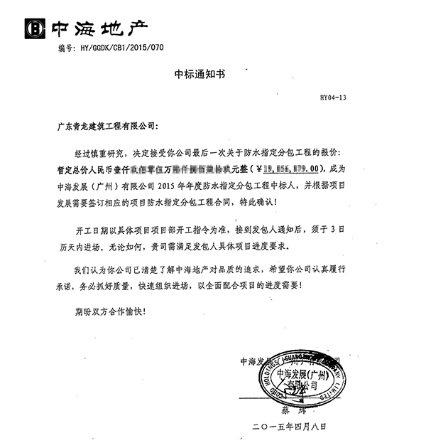 青龍集團中標中海地產(chǎn)廣州防水項目通知書