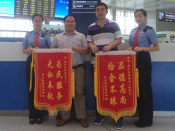 據(jù)悉,青龍公司宋先生在一次出差途經(jīng)過南寧東站時(shí),由于行程匆忙,在候車室將一個(gè)重要行李箱遺失。原本以為車站人員混雜,行李箱很難找回,沒想到被正在值班的二班員工陳芳女士細(xì)心發(fā)現(xiàn)并通過廣播尋找到宋先生。行李箱的失而復(fù)得,讓宋先生非常驚喜。為感謝動(dòng)南寧東站客運(yùn)中心,感謝陳芳女士細(xì)心和責(zé)任,更為了宣揚(yáng)難能可貴的質(zhì)拾金不昧的正能量,出差在外的宋先生特別囑咐同事一定要好好感謝南寧東站客運(yùn)中心及陳芳女士。