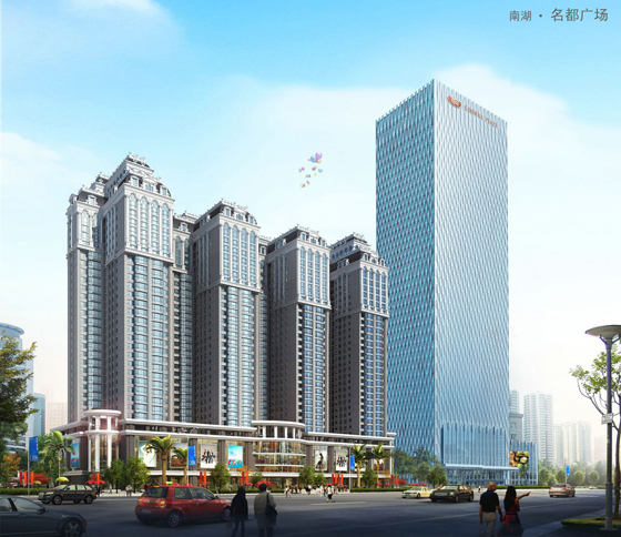 南湖名都廣場是南寧港昌房地產(chǎn)有限公司投資興建的高層建筑綜合體,集住宅、商業(yè)、寫字樓、酒店為一體,總建筑面積約為30.5萬平方米。項目分為兩個部分,其中A座為皇冠假日酒店和高檔寫字樓,其建筑外立面為水波幕墻設(shè)計,由數(shù)以千計的雙層中空low-e幕墻純手工拼接而成。水波幕墻具有減少光污染的作用,它利用光漫反射原理裝成,在滿足樓宇采光的同時,極大地降低了光污染,更加環(huán)保從而降低能耗。