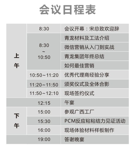 為了提高代理商的銷售積極性,促進(jìn)代理商之間的溝通和交流,增進(jìn)公司與代理商之間的感情,從而增強(qiáng)團(tuán)隊(duì)的凝聚力,提升渠道隊(duì)伍的戰(zhàn)斗力,青龍集團(tuán)將在2014年1月7日在廣西南寧(廣西分公司)舉辦2013年度會(huì)議。年會(huì)將圍繞防水行業(yè)“整合、分享、共贏”等方面展開(kāi),熱忱歡迎青龍集團(tuán)全國(guó)代理商及有志于在防水行業(yè)掘金致富的求富人士參加。