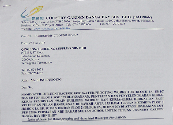 青龍集團(tuán)營銷總監(jiān)賀先生表示,此次競標(biāo)碧桂園馬來西亞金海灣防水項目共有多家防水企業(yè),經(jīng)過激烈角逐,青龍公司與東方雨虹等四家防水企業(yè)最終脫穎而出,且青龍與東方雨虹分別獲得防水面積較大的兩個項目。該防水項目的最終落實不僅是青龍集團(tuán)開拓國際市場的又一成功案例,也表明了青龍防水材料防水效果顯著,技術(shù)實力強勁,得到了國內(nèi)外客戶的高度肯定。