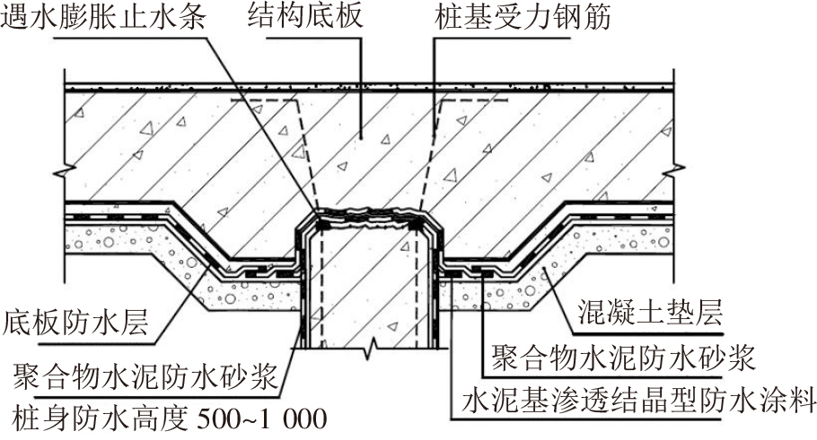 施工時,先對基層進(jìn)行清理,保證基面無灰塵、浮砂、雜物和明水;陰陽角用水泥砂漿抹成圓弧,然后對樁頭采用滲透結(jié)晶型防水涂料進(jìn)行涂刷,用量為1.5kg/m2左右,并將樁頭上的砂眼和細(xì)小縫隙用防水涂料密實(shí)。同時,在樁頭四周300mm左右范圍內(nèi)涂刷聚合物水泥防水砂漿作為過渡層(圖9)。