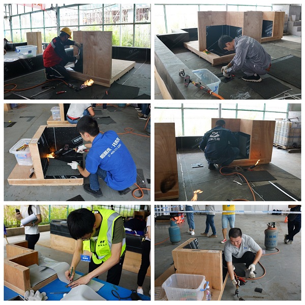 本次比賽,參賽選手同場競技改性瀝青防水卷材、高分子防水卷材施工兩大項目,理論考試現(xiàn)場,選手們沉著冷靜地完成作答;實操比賽中,參賽選手嚴肅認真地按照標準化施工模式進行了實際操作和規(guī)范處理。